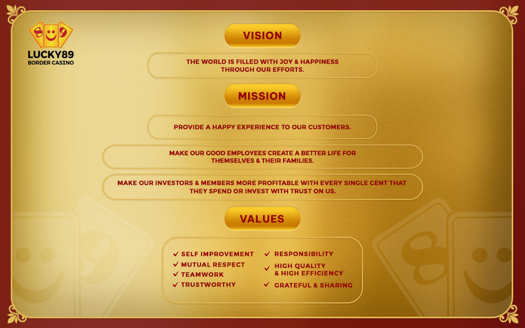 Tại Lucky89 Border Casino, chúng tôi đề cao các giá trị sau trong tất cả hoạt động kinh doanh và vận hành hàng ngày. Tầm nhìn, Sứ mệnh và Giá trị của chúng tôi đã tạo nên văn hóa là nền tảng cho sự phát triển của tổ chức cũng như đội ngũ nhân viên.